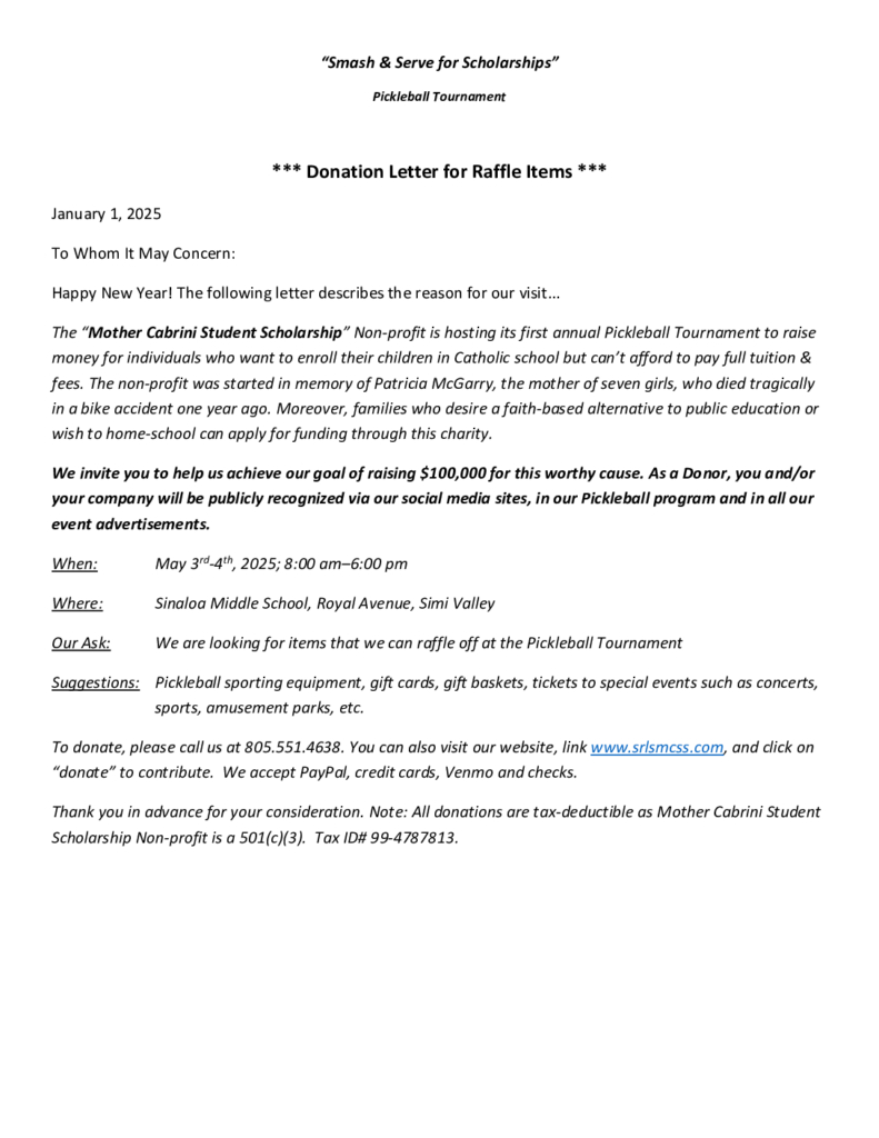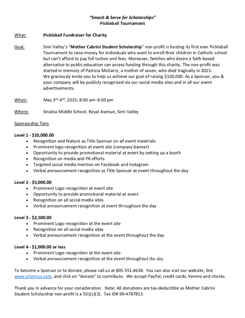 Simi Valley’s “Mother Cabrini Student Scholarship” non-profit is hosting its first ever Pickleball Tournament to raise money for individuals who want to enroll their children in Catholic school but can’t afford to pay full tuition and fees.